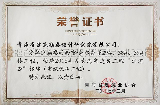 我院巖土公司勘察的西寧? 薩爾斯堡29#、38#、39#樓工程,榮獲2016年度青海省建設(shè)工程“江河源“杯獎(省級優(yōu)質(zhì)工程)。