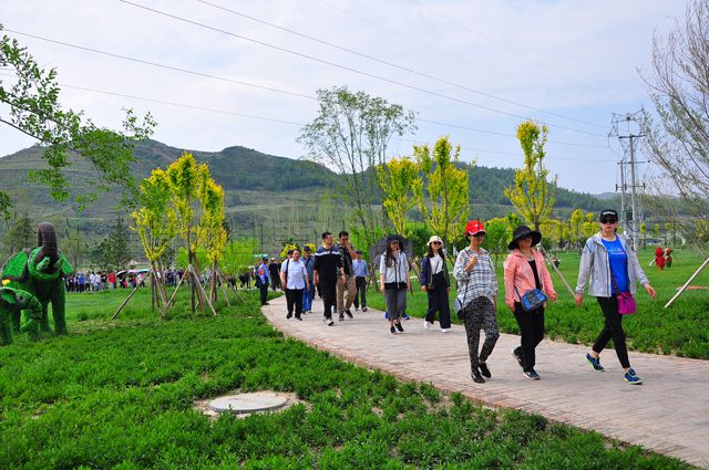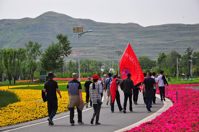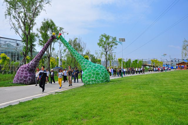 六月的高原,藍(lán)天白云,烈日當(dāng)頭。適逢周末,游人如織,從出發(fā)地向景區(qū)中心地帶挺進(jìn),徒步在景園的觀景小道,處處姹紫嫣紅,映入眼簾的是一大片一大片絢麗的迎賓花海?;êV黝}區(qū)地勢呈中間高兩邊低的整體走勢。廣場、花海、雕塑、鄉(xiāng)趣園等不同主題的區(qū)域花海,阡陌交錯,異彩紛呈。大家在徒步旗手的引領(lǐng)下,在沁人心脾的花香牽引下,踏進(jìn)極具田園色彩的大通匯豐景園。虞美人、丁香花、矮牽牛、孔雀草、萬壽菊等二十余種時令花卉,與其間各類花塑形成姿態(tài)各異的適季鮮花景觀,加上椒紅蔥綠的各色蔬菜園景觀,在風(fēng)車的催動下,猶如一幅鋪向天際的流動畫卷。滿含泥土氣息的五谷豐登與彩陶藝術(shù)雕塑,讓我們仿佛置身于那個簡單、古樸的年代,久遠(yuǎn)的文化、淳樸的民風(fēng)與累累的碩果相得益彰,猶顯自在天然。徒步其中,聽自然和諧旋律,看輕風(fēng)拂起麥尖,一處處田園風(fēng)情蔓延開來,或耕、或碾、或織、或閑,時有鄉(xiāng)土味十足的卡通形象和稻草人穿插其間,瓜田李下、留客人家,鶯啼又燕舞,地沃而田肥,不禁喚起我們深藏在心中“守拙歸田園”、“把酒話桑麻”的美好回憶。
