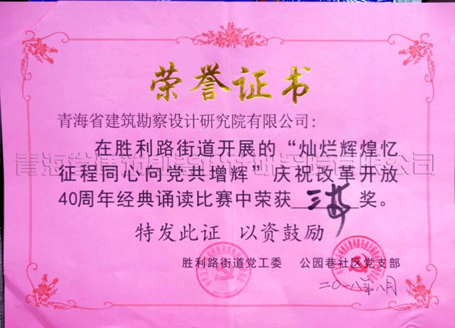 8月2日,西寧市城西區(qū)勝利路黨工委和公園巷社區(qū)黨支部在轄區(qū)聯(lián)合舉辦了“燦爛輝煌憶征程,同心向黨共曾輝”慶祝改革開放40周年經(jīng)典誦讀比賽,我公司設(shè)計(jì)一所張麗潔代表單位參賽,她朗誦的詩(shī)歌——《憶黨史、頌黨情、跟黨走》,在本次誦讀比賽中為單位贏得誦讀比賽三等獎(jiǎng)。特向參賽者表示祝賀。