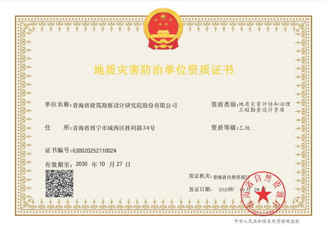 近日,公司獲得由青海省自然資源廳頒發(fā)的“地質(zhì)災(zāi)害評(píng)估和治理工程勘查設(shè)計(jì)資質(zhì)(乙級(jí))”,標(biāo)志著公司在地質(zhì)災(zāi)害防治領(lǐng)域的業(yè)務(wù)能力和專業(yè)實(shí)力邁上新的臺(tái)階。